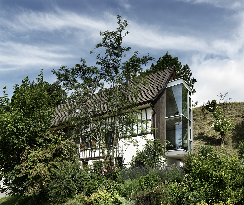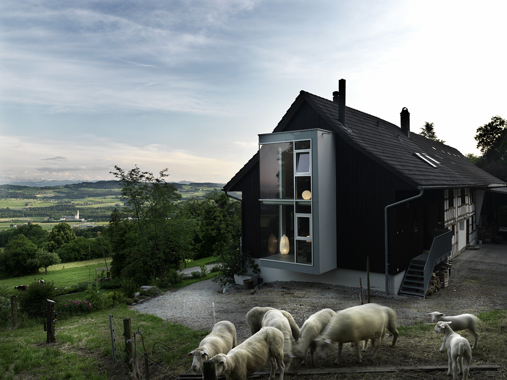 VA breathtaking panorama from the Austrian Alps, passing the Säntis to the Oberland, for this typical old farmhouse in the heart of Thurgovia, canton of Eastern Switzerland. Layout and interior design of the barn portion converted into a loft-house on 3 floors. Landscaping of the adjoining garden.
